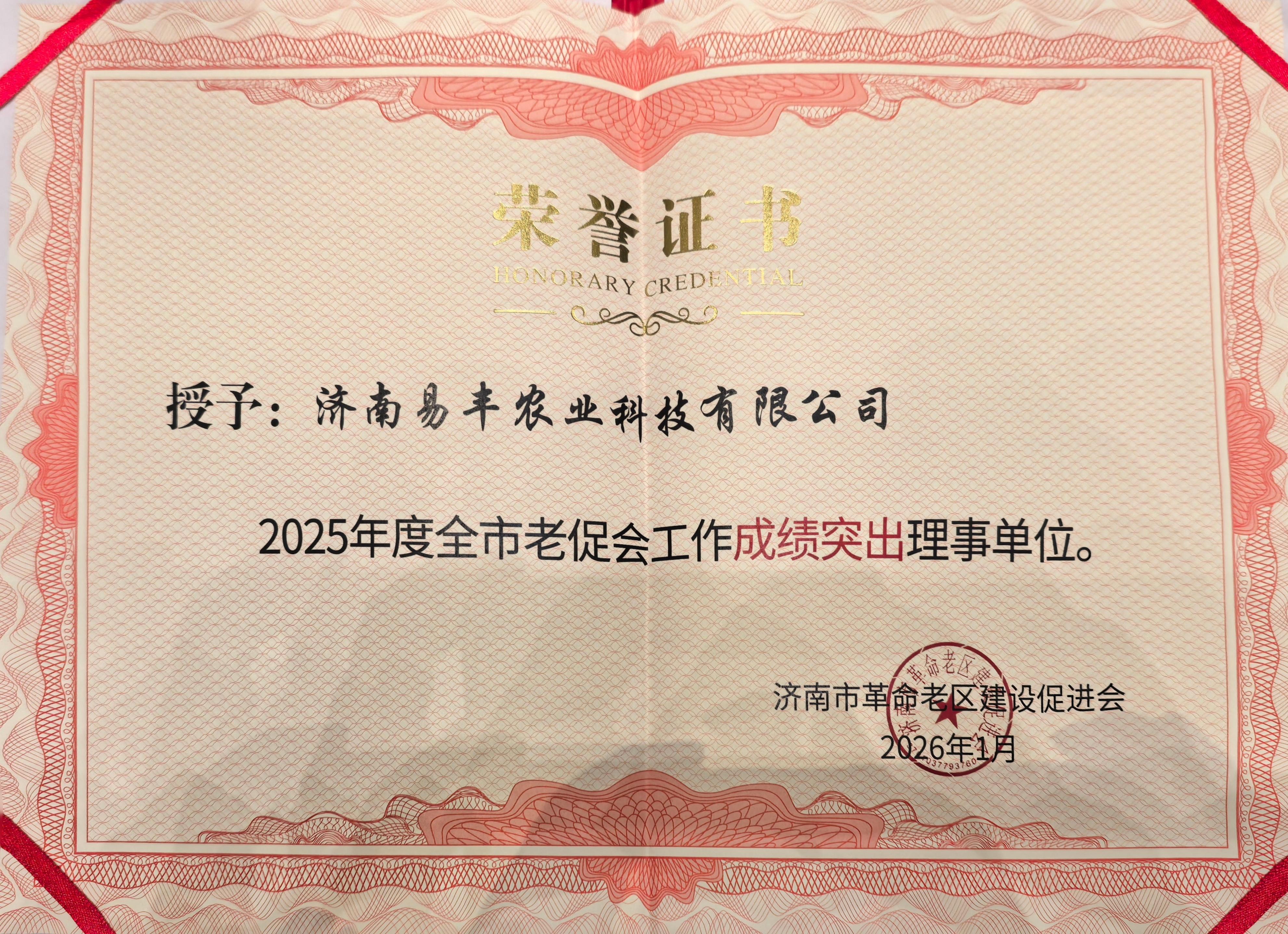 會議全面總結(jié)2025年度全市老區(qū)建設(shè)工作成效,部署2026年重點任務(wù),并對實績突出的先進單位和個人進行了表彰。易豐農(nóng)業(yè)憑借在革命老區(qū)公益幫扶與社會責(zé)任實踐中的優(yōu)異表現(xiàn),榮獲“2025年度全市老促會工作成績突出理事單位”稱號。