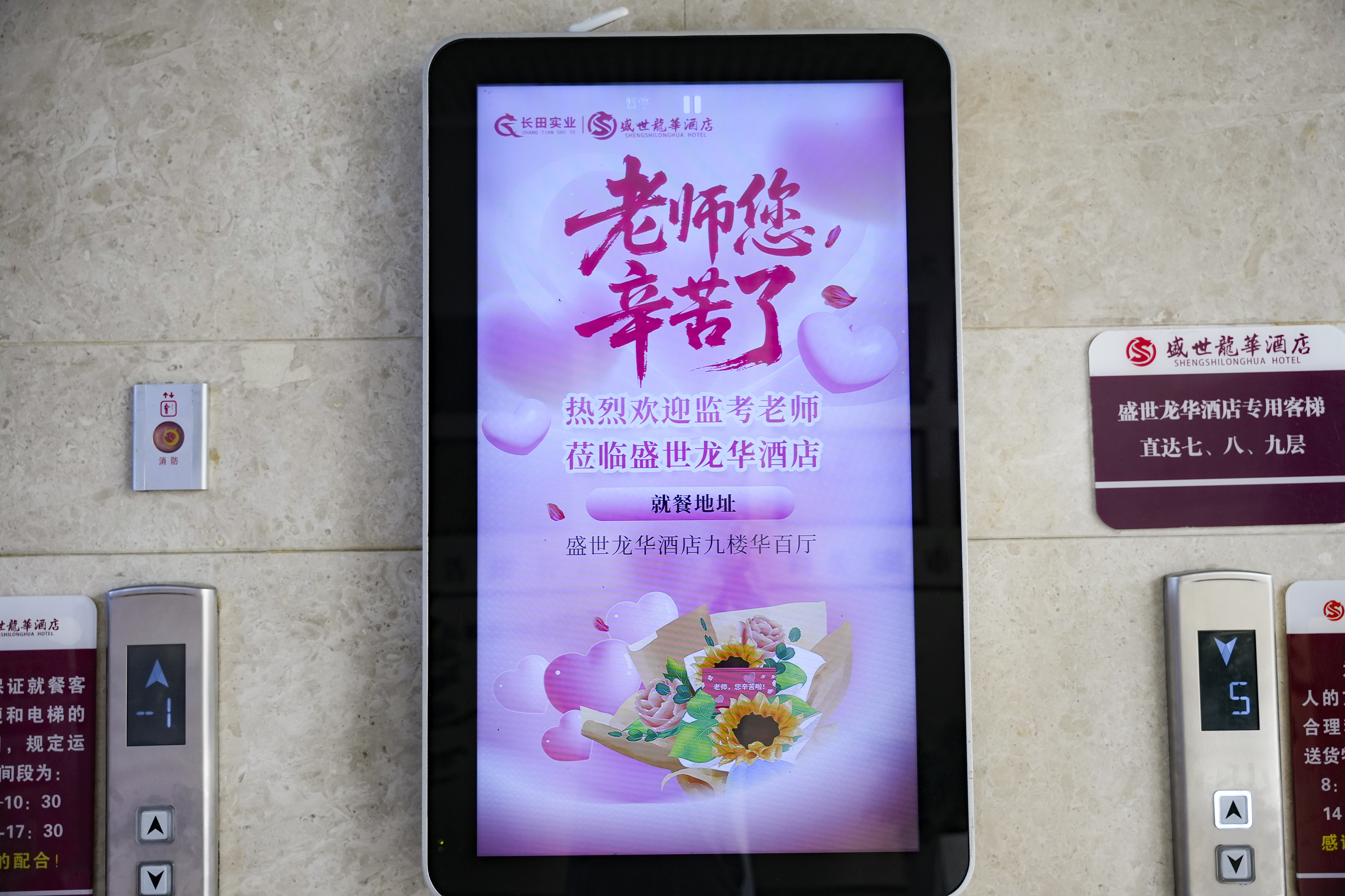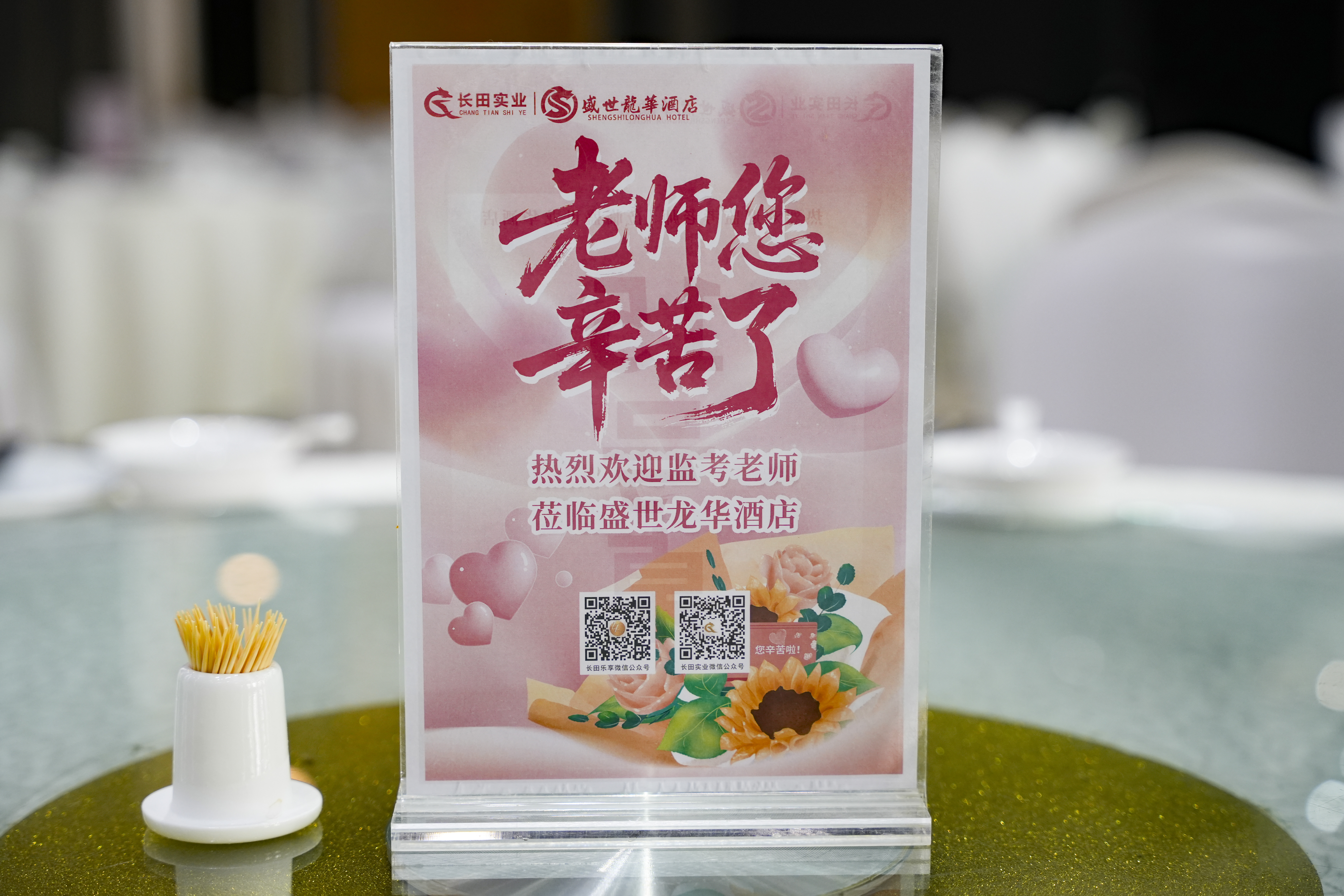 為了表達(dá)對(duì)監(jiān)考老師的歡迎,盛世龍華酒店在細(xì)節(jié)上做足了功夫。酒店門(mén)口的LED屏滾動(dòng)播放著熱情洋溢的歡迎詞,一樓和九樓入口處擺放著精心設(shè)計(jì)的海報(bào),電梯廣告機(jī)也循環(huán)播放著對(duì)老師們的歡迎話語(yǔ),讓老師們一踏入酒店就能感受到滿(mǎn)滿(mǎn)的溫暖和尊重。每張餐桌都擺放著號(hào)碼牌,背面同樣印有“老師,您辛苦了”的字樣,方便老師們就座。