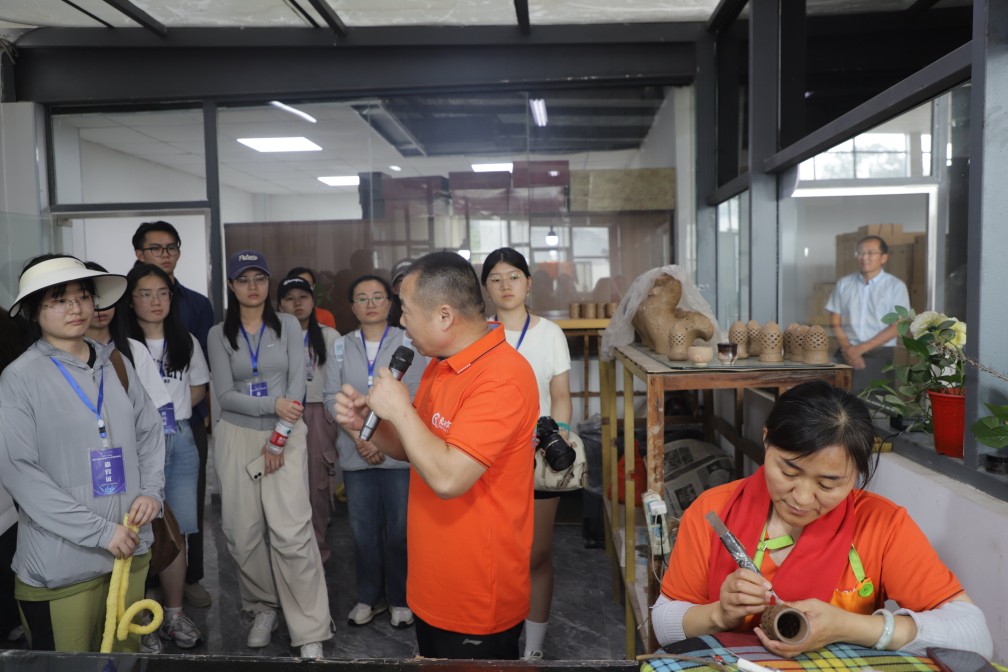 龍格黑陶藝術(shù)研究院內(nèi),傳統(tǒng)工藝與現(xiàn)代創(chuàng)新的完美融合。省級(jí)非物質(zhì)文化遺產(chǎn)項(xiàng)目代表性傳承人徐慶增老師帶領(lǐng)師生們參觀黑陶生產(chǎn)車(chē)間,他特別提到,濟(jì)陽(yáng)黑陶以黃河泥為原料,經(jīng)選土、拉坯、雕刻、燒制等20余道工序制成,其“黑如漆、亮如鏡”的獨(dú)特質(zhì)感源于高溫窯變的自然反應(yīng)?,F(xiàn)場(chǎng)演示了拉坯、雕刻技藝,手中的陶土仿佛被賦予了生命,在指尖的舞動(dòng)下逐漸成型。師生們?cè)趯?zhuān)業(yè)藝人的指導(dǎo)下,從揉泥、拉坯到成型,親自體驗(yàn)了黑陶的制作,最終創(chuàng)作出了屬于自己的黑陶作品。